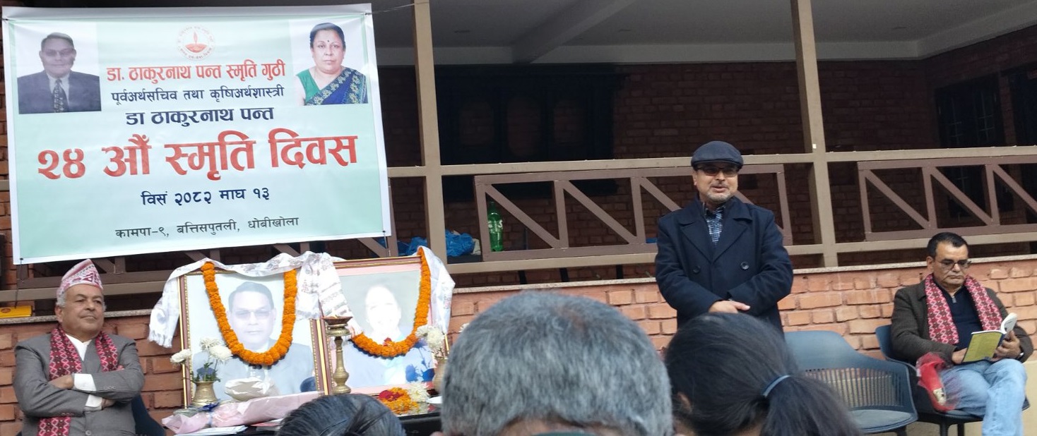 पूर्व अर्थसचिव तथा कृषि अर्थशास्त्री डा. ठाकुरनाथ पन्तको २४औँ स्मृति दिवस काठमाडौँमा सम्पन्न भएको छ। डा. ठाकुरनाथ पन्त स्मृति गुठीको आयोजनामा मङ्गलबार (माघ १३ गते) आयोजित कार्यक्रममा समाज, शिक्षा, न्याय र साहित्य क्षेत्रका विशिष्ट व्यक्तित्वहरूको उपस्थिति रहेको थियो।